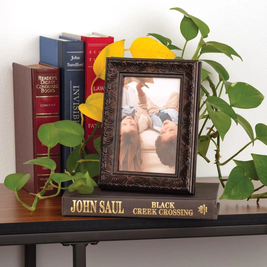 Showcase your photos and artwork beautifully by putting your cherished picture in a pretty tabletop frame. This stylish, beautifully accented, bronze finished frame is perfect for displaying a favorite wedding photo, school picture or other treasured images.