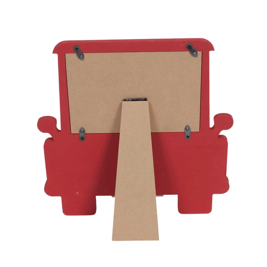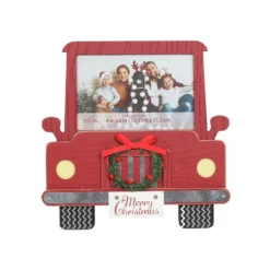 Display a photo within this festive red truck frame. It features a mini wreath and a “Merry Christmas” decorative licence plate.