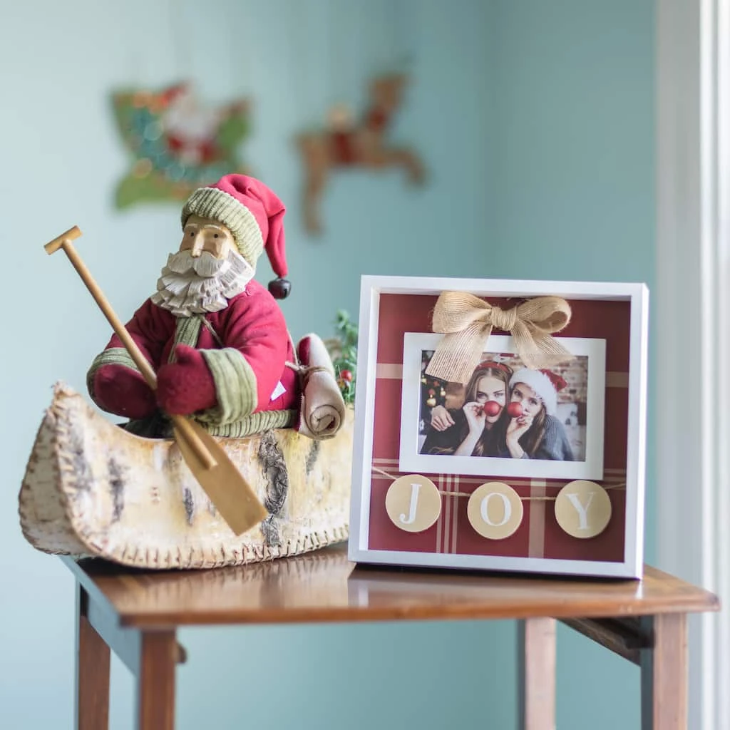 This charming frame is a wonderful way to incorporate your treasured photographs into your holiday décor. This white frame is set within a festive shadowbox decorated with the word “Joy” on circle garland against a red plaid background. Place on your mantel or a prominent side table to bring some Christmas cheer into your home.